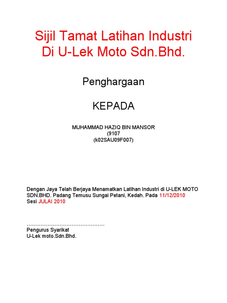 Sijil Tamat Latihan Industri Di 1 Pdf