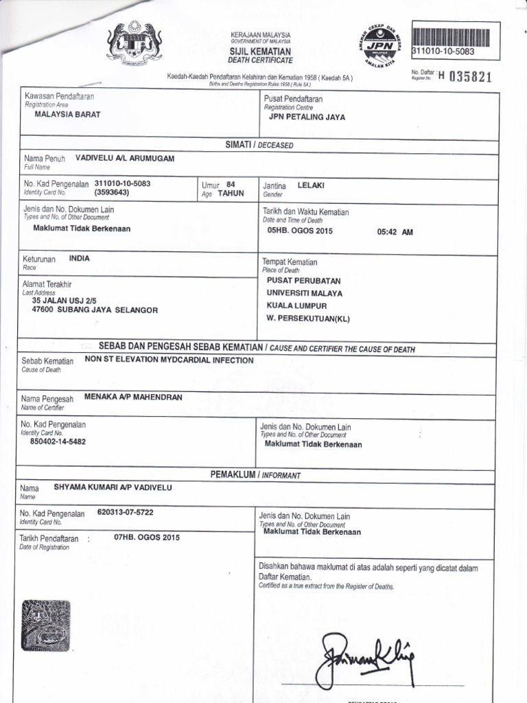 Sijil kematian extract. Laporan Polis sekiranya punca kematian akibat kemalangan atau sekiranya perlu Police. Lantas aku berfikir bagaimana sorang anak sanggup memalsukan sijil kematian ayahnya semata² tuk mengahwini teman lelakinya. 100 Natural Wart Products.