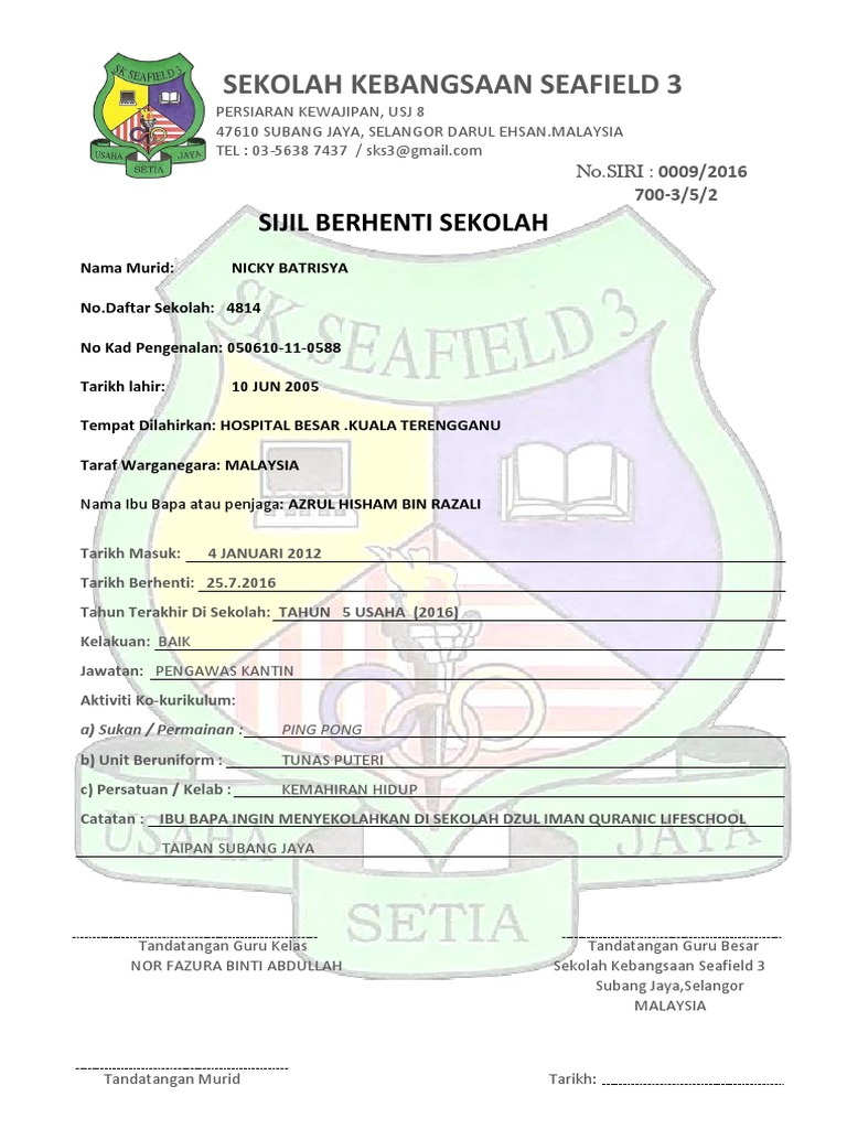 Nama bapapenjaga name of fatherguardian. Sijil Berhenti Sekolah In English For more information and source see on this link. Sijil Berhenti Sekolah Dan Sijil Akuan Sekolah Sekolahmalaysia Com.