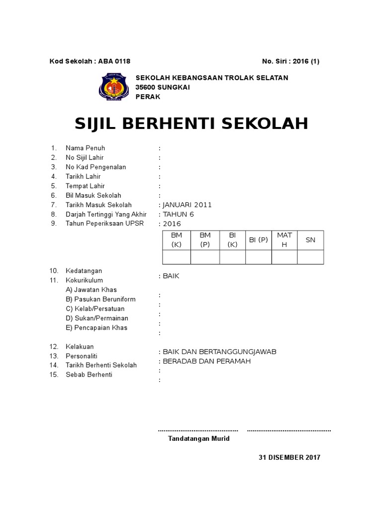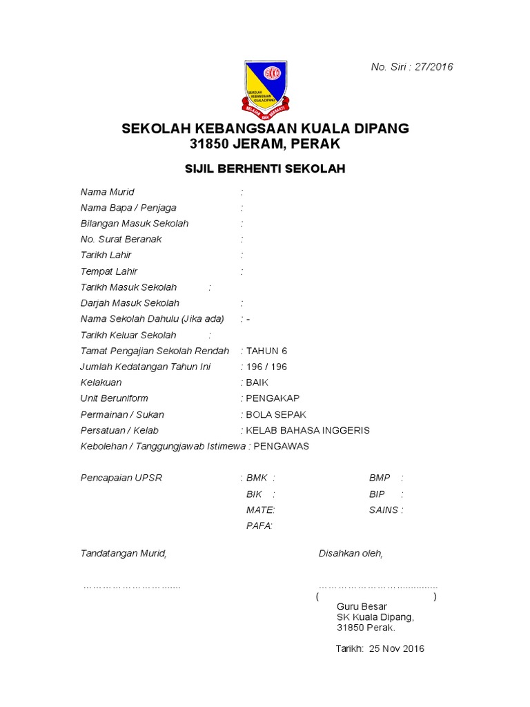 Jumlah halaman Sijil Berhenti Sekolah Rendah Lertyi. Semasa berhenti sekolah murid ini berada dalam tingkatan. Download as doc pdf txt or read online from scribd.