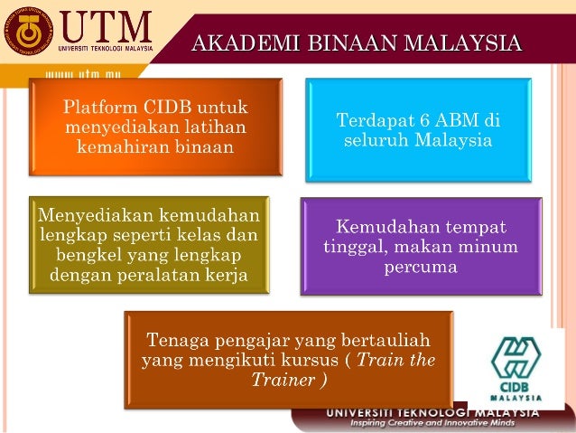 Pelatih yang berjaya menamatkan latihan dan lulus penilaian akan dianugerahkan Sijil Kecekapan Kemahiran CIDB yang mengiktiraf mereka sebagai pekerja mahir. Penguasaan pengetahuan dan kemahiran dalam bidang pengkhususan yang diikuti. TVET technical and vocational education and training merupakan singkatan bagi Pendidikan dan Latihan Teknikal dan Vokasional.
