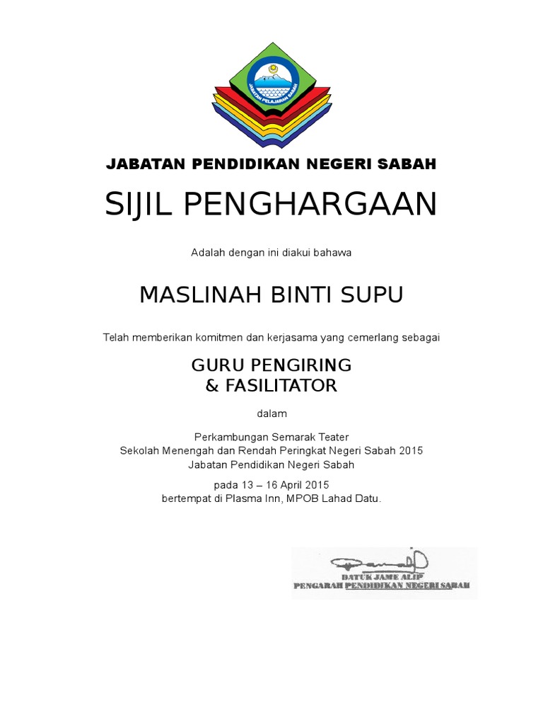 Contoh Sijil Penghargaan Kepada Penceramah Sijil Anugerah Pelajar Terbaik Majlis Graduasi. Surat panggilan yang telah disahkan oleh penyelia bahawa pegawai telah hadir danatau 5. Full modul kursus kepimpinan1 1.