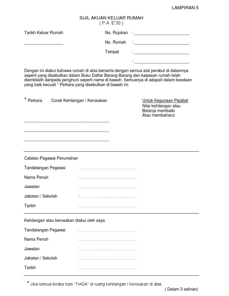 Perintah Am Bab E Perlu diisi dalam 7 salinan Borang ini hendaklah diisikan oleh Pegawai-Pegawai Peruntukan apabila rumah-rumah kerajaan diuntukan dan oleh penduduk-penduduk yang keluar apabila rumah kerajaan dikosongkan. Borang atau sijil akaun keluar rumah perlu diisi pada waktu itu jugak. Boleh buat tambah-tambah untuk holiday kat Phuket nanti kan.